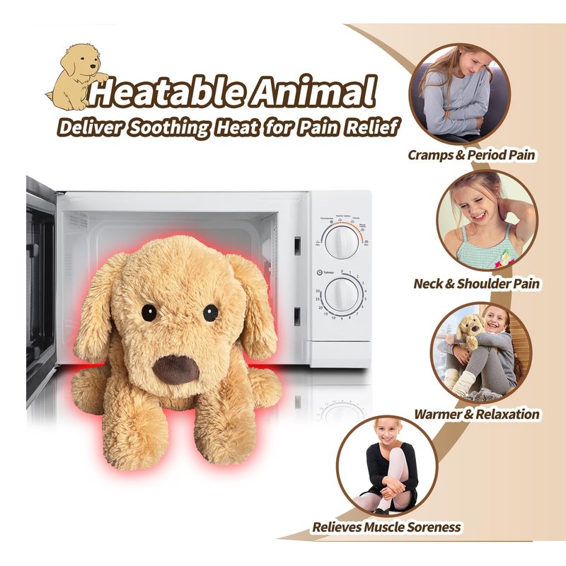 - THOUGHTFUL AND HEARTFELT GIFT FOR YOUR BELOVED ONES: With a cordless design for safety and portability, this cute puppy stuffed animal can be taken anywhere. Warm it up in the microwave for 60 seconds to enjoy a soothing warmth for up to 30 minutes, perfect for muscle relaxation, pain relief, and stress reduction. Or, chill it in the freezer for 4 hours to experience refreshing coolness, providing relief from inflammation, muscle aches, and fatigue. This stuffed dog plush is the perfect companion to keep you cozy when the weather turns chilly
