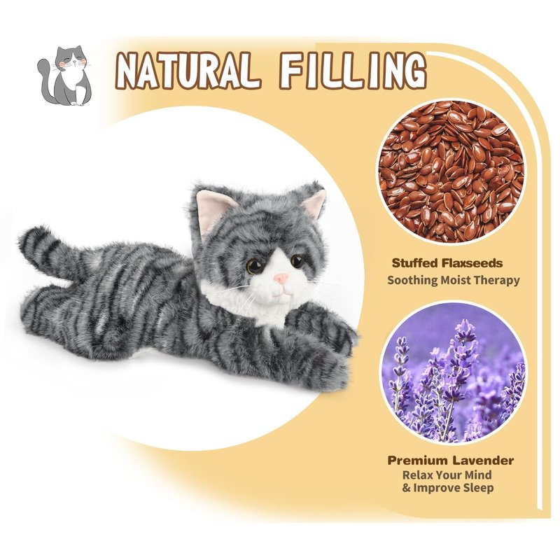 - NATURAL AND SAFE: Filled with natural flaxseeds, our stuffed gray tabby plush provides longer-lasting, comforting moist heat than other fillings like wheat. It promotes circulation and eases cramps, while the subtle lavender scent offers floral and fresh notes to calm your senses, relieve headaches, and soothe menstrual discomfort. It’s the perfect comfort gift for girls experiencing their first period cramps, helping to improve sleep and well-being during this important time
