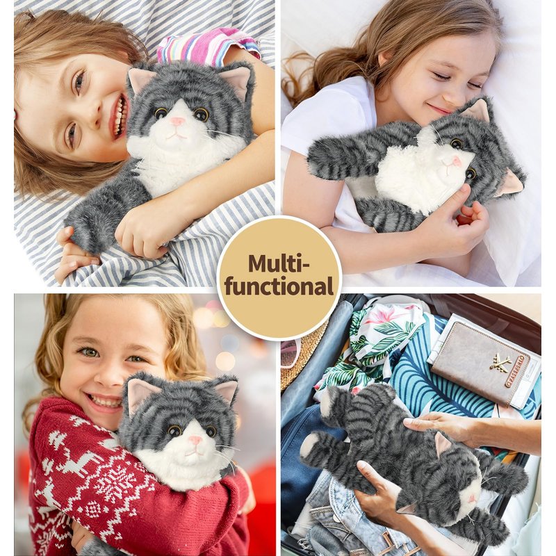 - THOUGHTFUL AND HEARTFELT GIFT FOR YOUR BELOVED ONES: With a cordless design for safety and portability, this stuffed gray tabby cat can be taken anywhere. Warm it up in the microwave for 60 seconds to enjoy a soothing warmth for up to 30 minutes, perfect for muscle relaxation, pain relief, and stress reduction. Or, chill it in the freezer for 4 hours to experience refreshing coolness, providing relief from inflammation, muscle aches, and fatigue. This stuffed cat plush is the perfect companion to keep you cozy when the weather turns chilly