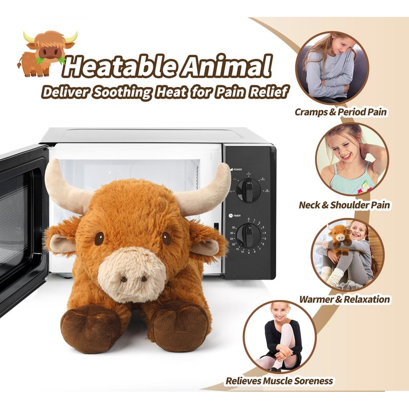 - THOUGHTFUL AND HEARTFELT GIFT FOR YOUR BELOVED ONES: With a cordless design for safety and portability, this heatable plush bull cow can be taken anywhere. Warm it up in the microwave for 60 seconds to enjoy a soothing warmth for up to 30 minutes, perfect for muscle relaxation, pain relief, and stress reduction. Or, chill it in the freezer for 4 hours to experience refreshing coolness, providing relief from inflammation, muscle aches, and fatigue. This cow stuffed animal is the perfect companion to keep you cozy when the weather turns chilly