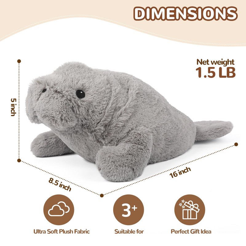 - LIFELIKE MANTEE PLUSH APPEAEANCE: This plush is approx: 16"L x 8.5"W x 5"H in size. Meet your perfect heated stuffed animals manatee companion, resting in a cozy, lay-down position for added cuteness and comfort. This manatee stuffed animals is irresistibly soft, featuring shaggy fur, an endearing facial expression. It's the ideal cuddle buddy, bringing warmth and joy to both kids and adults alike. A unique and delightful gift for any manatee lover, sure to add charm to any setting
