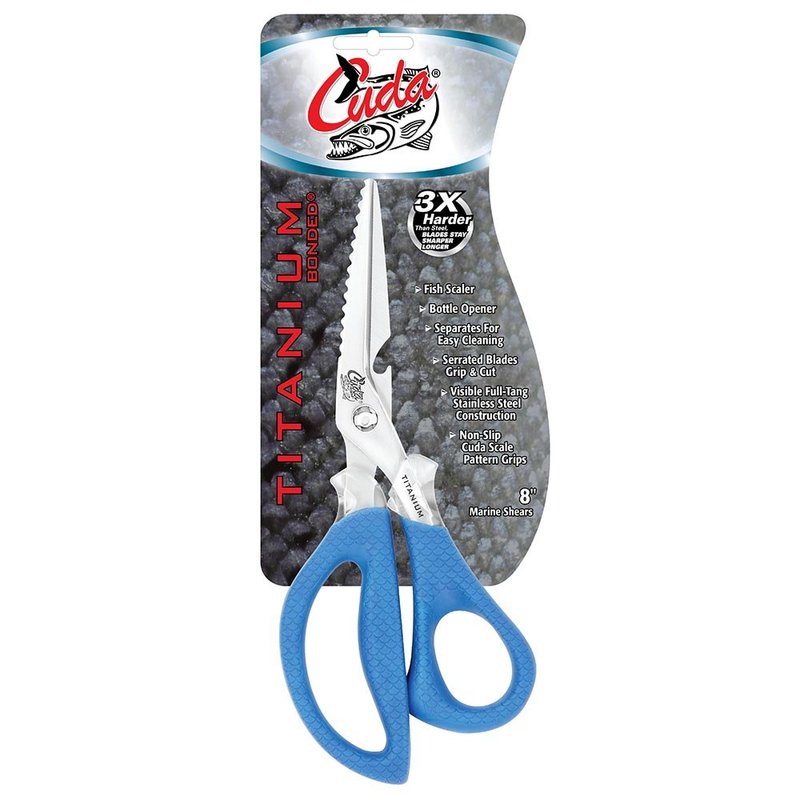 - SERRATED BLADES & FISH SCALING EDGE - The Cuda 8" Marine Shear boasts a Fish Scaling Edge tailored for fish scale removal and serrated blades offering precise and efficient performance when cutting through bone, skin, cartilage, and other materials