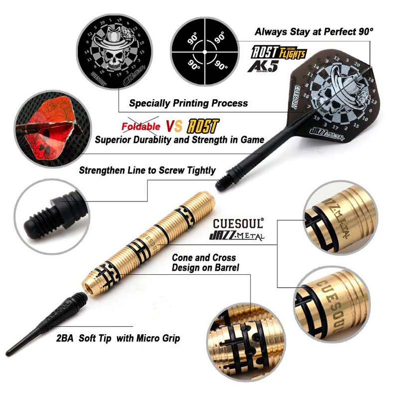 - ALL YOU NEED FOR QUALITY DARTS IN 1 SET: we have included in our set: beautiful carrying case + 6pcs CUESOUL pro brass darts barrels + 6pcs AK5 integrated flight + 36pcs plastic tips + darts game guideline. That is all you need! This soft tip darts set with integrated dart flights will not fall, making it extremely easier to use and adapt to your needs.