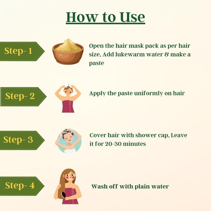 - Ease Of Application: Experience effortless application of our hair mask. Simply mix the hair mask powder for men & women as per hair your length (1 sachet for small hair, 2 sachets for medium hair, 3 sachets for long hair and 4 sachets for extra long hair) with lukewarm water and stir to make creamy paste. Apply the paste uniformly on hair.Cover hair with shower cap. Leave for 15 to 30 min.Wash Off with plain water.