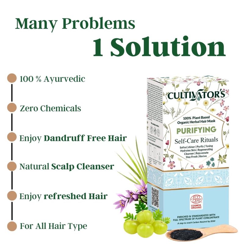 - Say Hi to Organic Hair Mask: Cultivator’s Purifying Hair Mask is made using Cassia, Amla, Amla Charcoal, & lemongrass to control dandruff & cleanse your scalp. The goodness of Organic herbs helps remove oil & other impurities to provide a pure & healthy scalp. This vegetal hair mask works effectively on the scalp to give strength & nourishment to your hair. It is a powerhouse of fully concentrated plant powder that works like a miracle for hair & scalp health.♀️