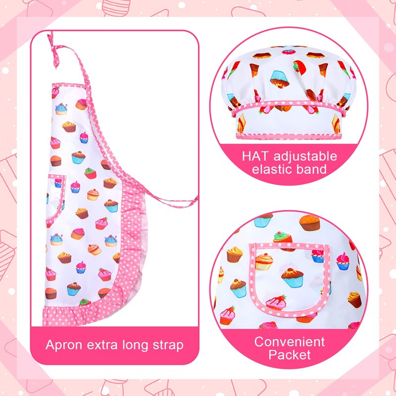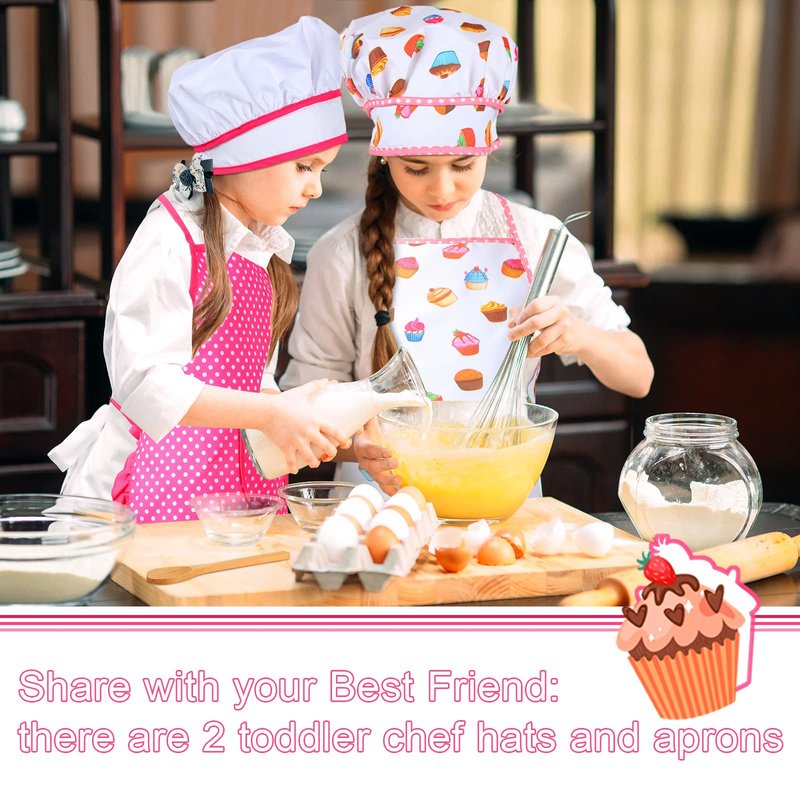 - Share with Best Friend: there are 2 toddler chef hats and aprons, one is pink with white polka dots and ruffled edges, the other one is white with some cupcake on it, vivid and cute; Your kid can share with best friend and enjoy the cooking time together