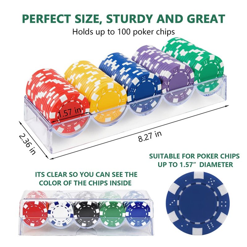 - Measures: 8.3"L x 3.2"W x 2.2"H. 5 Rows hold 20 chips each for a total of 100 chips.