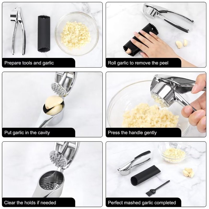 - ✅【EASY TO USE】- Unpeel the cloves with the silicone clove peeler(Peeler is inlcuded). Open the pressing head and put the peeled cloves in the cavity. Close the press, and squeeze the handle. Then you get perfect minced garlic in your bowl. The ergonomic non-slip handle keeps your hand protected and makes crushing garlic a breeze!