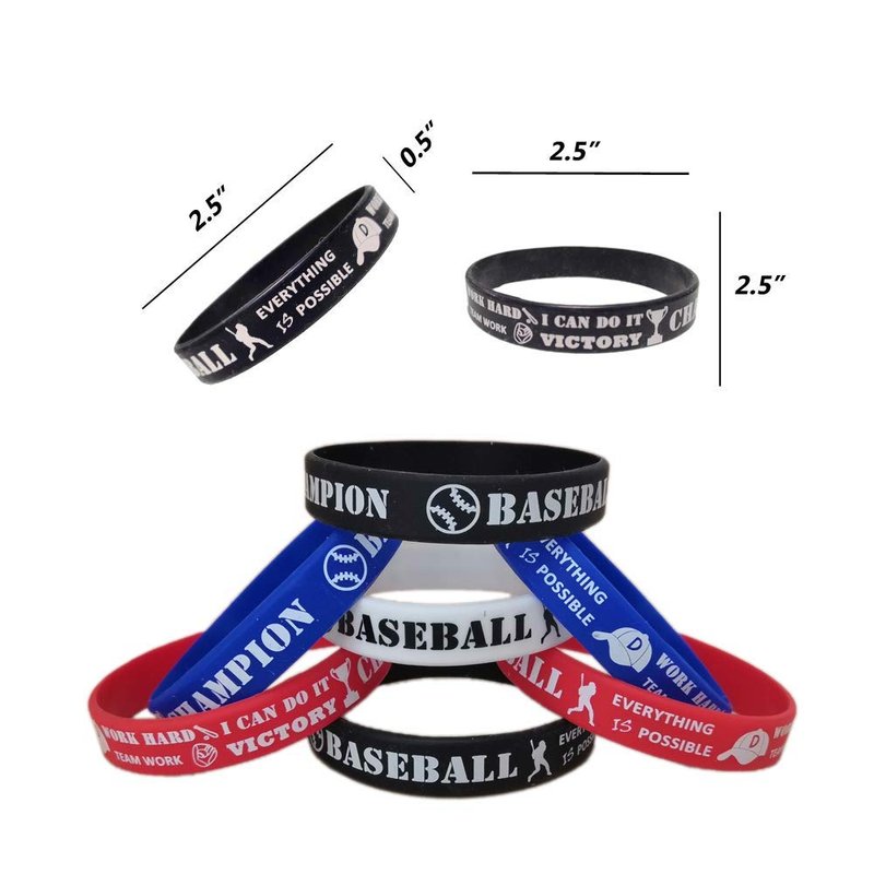 - 24 Pack of Baseball Silicone Bracelets are just what you looking for(Black x 6, White x 6, Red x 6 and Blue x 6).
