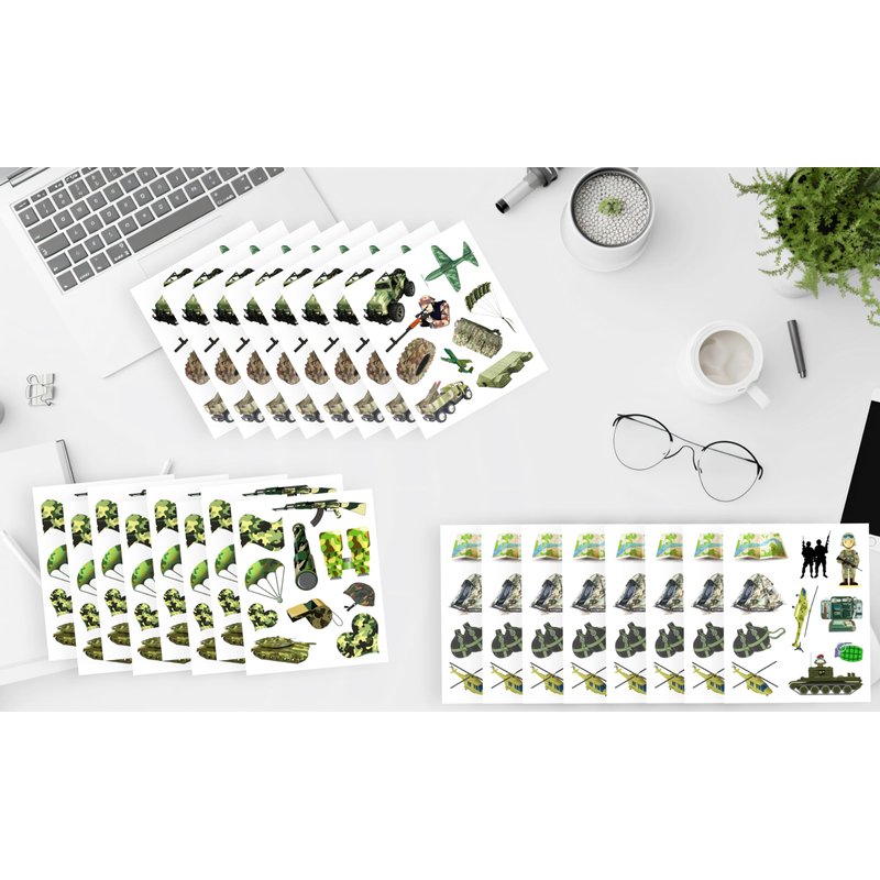 - Package of 290 pcs camouflage themed temporary tattoos with more than 20 designs.