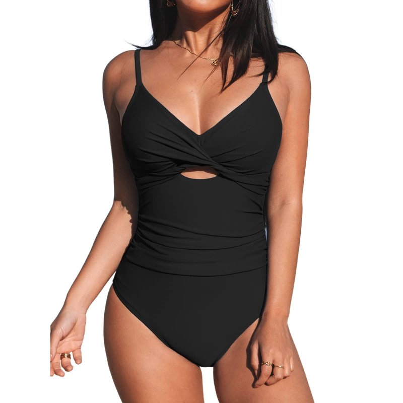 CUPSHE One Piece Swimsuit for Women Bathing Suits Twist Front Cutout Adjustable Straps Ruched Swimwear L, Black