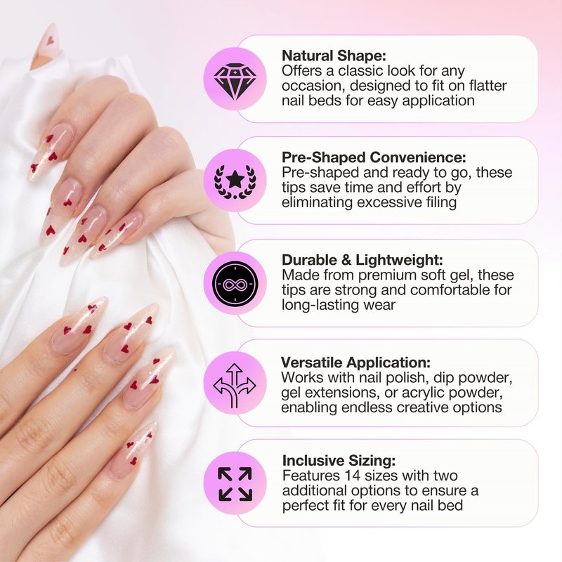 - STYLE YOUR WAY: Achieve salon-quality nails effortlessly with our pre-shaped Soft Gel Tips, designed to minimize filing and enhance durability. Featuring a flatter shape, Natural tips blend seamlessly with flat and wide nail beds, creating a natural extension that feels like your own. Choose from five elegant shapes and three lengths to complement your unique style.