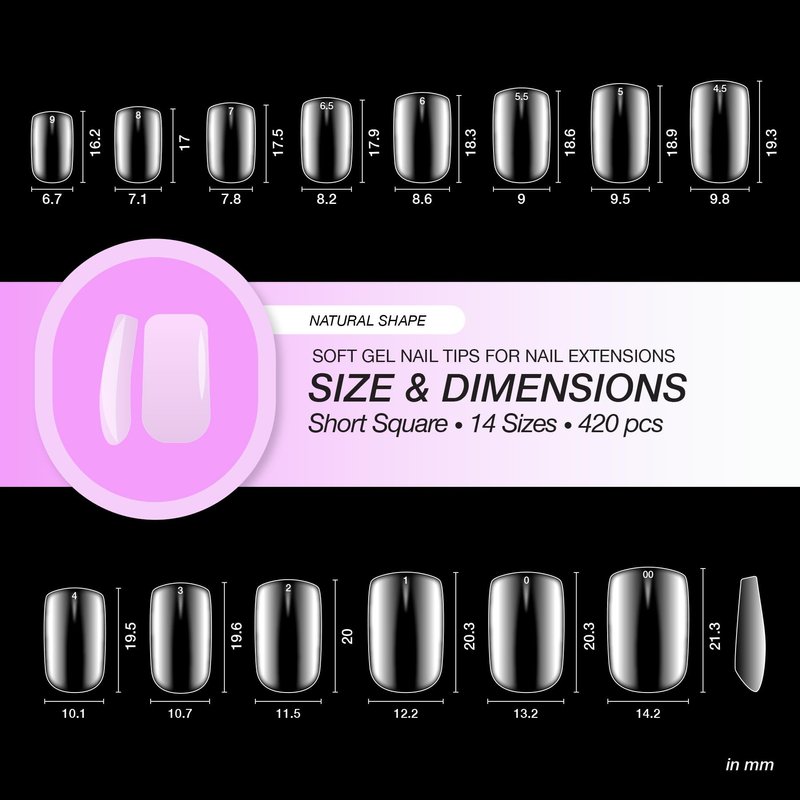 - INCLUSIVE SIZING: With 420 pieces in 14 different sizes, including two additional options, our Soft Gel Nail Tips ensure a precise fit for every nail bed. Each tip is individually numbered for easy selection, making customization effortless. Whether you have wide, narrow, or standard nail beds, our versatile sizing system provides a comfortable and professional-looking application every time.