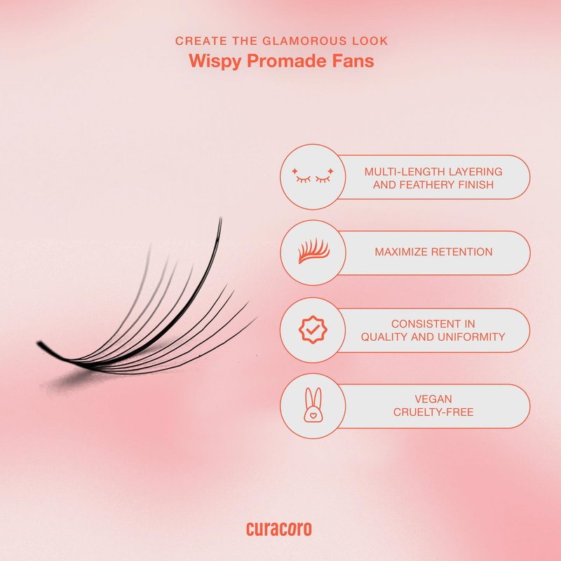 - WHY CURACORO PROMADE WISPY FANS — Handcrafted from premium PBT material, these wispy lashes are soft, dark, and sleek, with a petite base for easy application. Loved by lash artists around the globe, our Promade Wispy Fans deliver exquisite, wispy lash extensions with unmatched quality and performance. Trusted by experienced eyelash technicians worldwide, Curacoro Promade Wispy Fans set the bar high for creating stunning, voluminous looks.