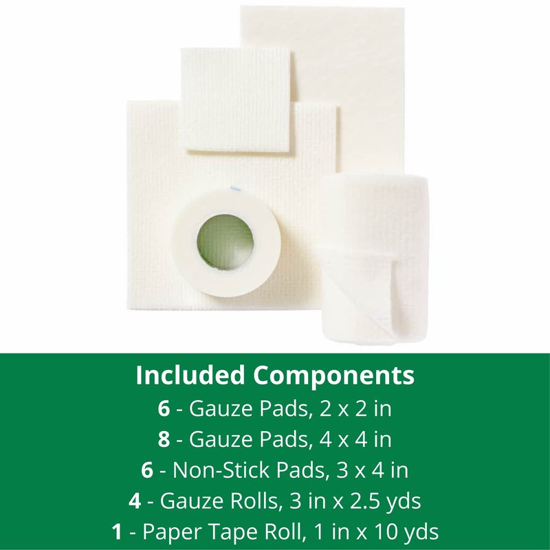 - Wound care essentails: comes fully stocked with wound care items to protect, cover and cushion when you need it most. Includes two different size gauze pads, 6 non-stick pads, 4 gauze rolls, 1 paper tape roll