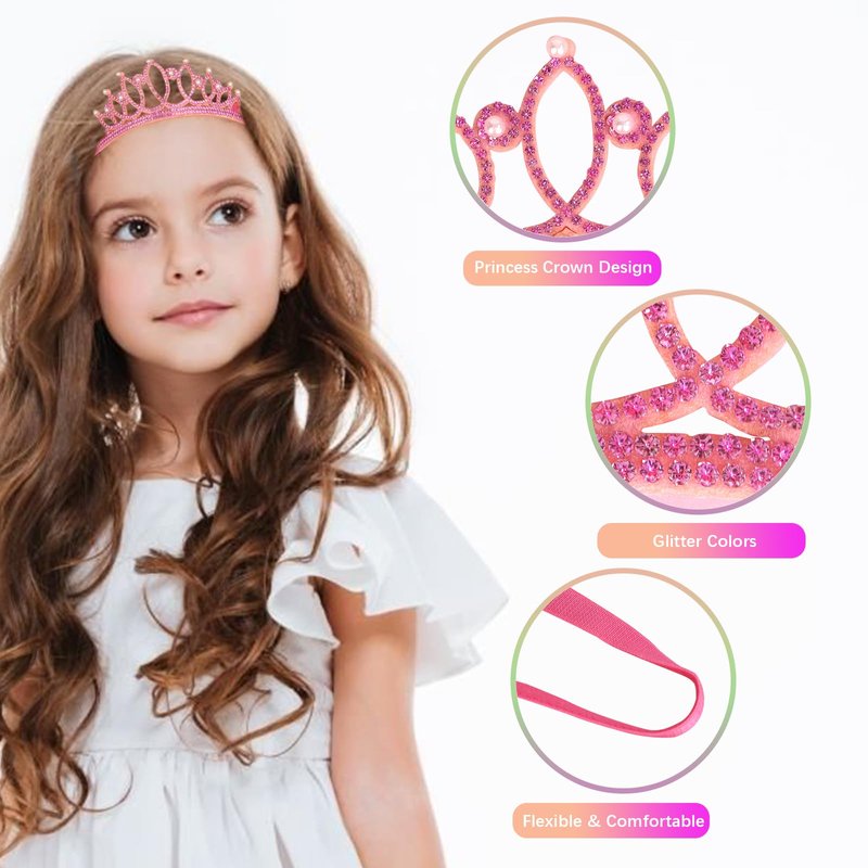 - Unique Design: Set of 3 tiara headband is designed with sparkling glitter crowns in pink, gold, and white and matching shimmer elastic ribbon to ensure a comfortable fit for your little girls dress up clothes for play