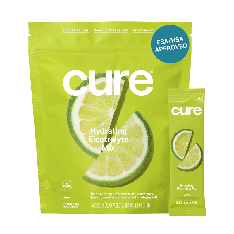Cure Hydrating Plant Based Electrolyte Mix | FSA & HSA Eligible | Powder for Dehydration Relief | Made with Coconut Water | Non-GMO | No Added Sugar | Vegan | Gluten Free | Pouch of 14 Packets - Lime