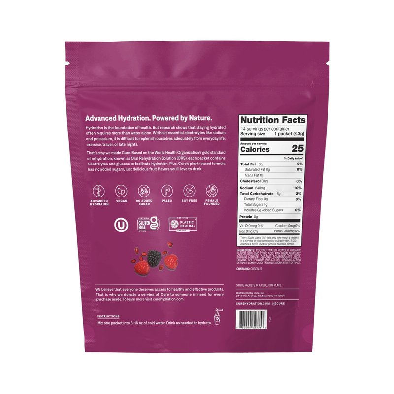 Cure Hydrating Plant Based Electrolyte Mix | FSA & HSA Eligible | Powder for Dehydration Relief | Made with Coconut Water | Non-GMO | No Added Sugar | Vegan | Pouch of 14 Packets - Berry Pomegranate