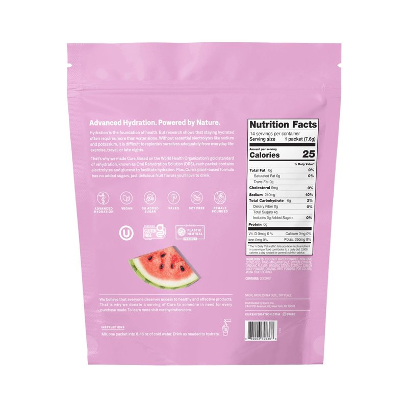 Cure Hydration | Plant-Based Electrolyte Drink Mix | No Added Sugar | Dehydration Relief Powder Made with Coconut Water | Non-GMO | Vegan | FSA & HSA | Pouch of 14 Packets - Watermelon