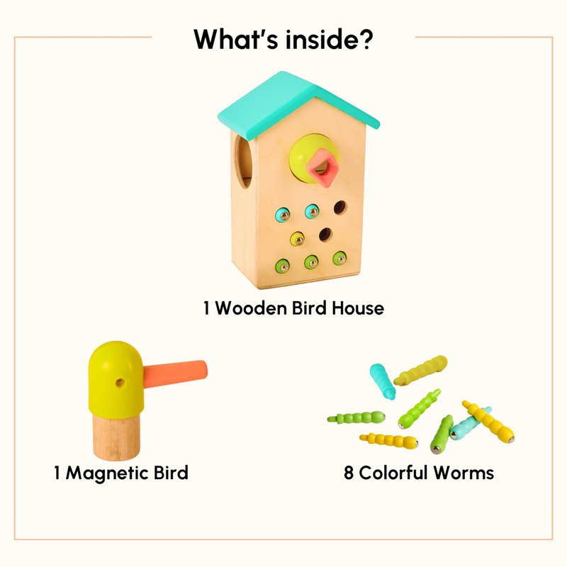 - INCLUDES: Each box includes 1 Wooden Bird House, 1 Magnetic Bird & 8 Colorful Worms