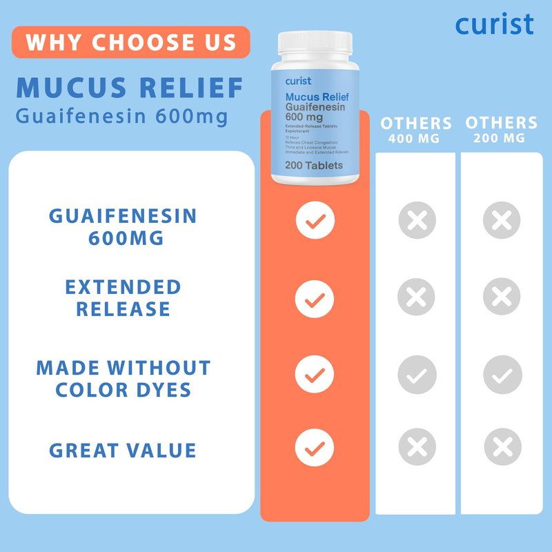 - SAY GOODBYE TO CONGESTION: Curist Mucus Relief contains 600 mg guaifenesin to thin and loosen mucus in your air passages which helps you breathe easier. Clears up congestion and helps relieve sinus pressure, stuffy nose, and post-nasal drip associated with allergies and colds. A triple win!