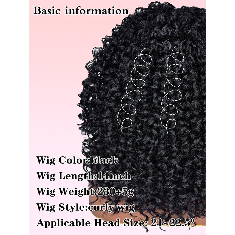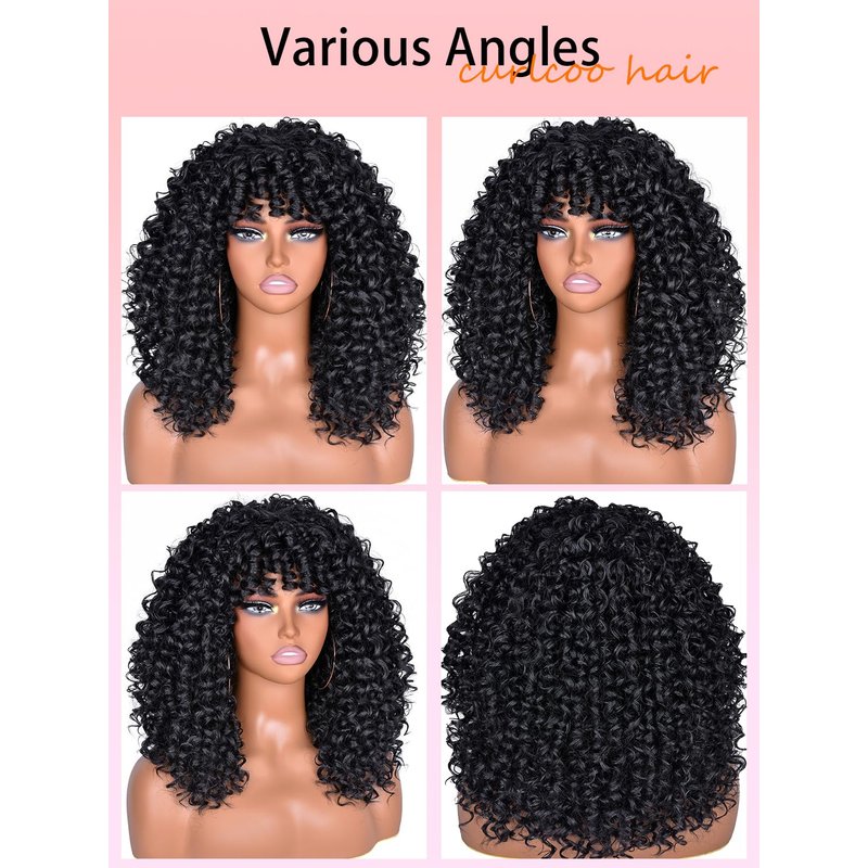 CurlCOO Black Curly Wigs for Black Women Short Kinky Curly with Bangs Synthetic Fiber Glueless Long Kinky Curly Hair 14 inch(Black)