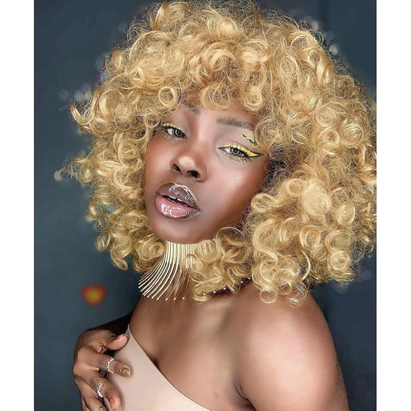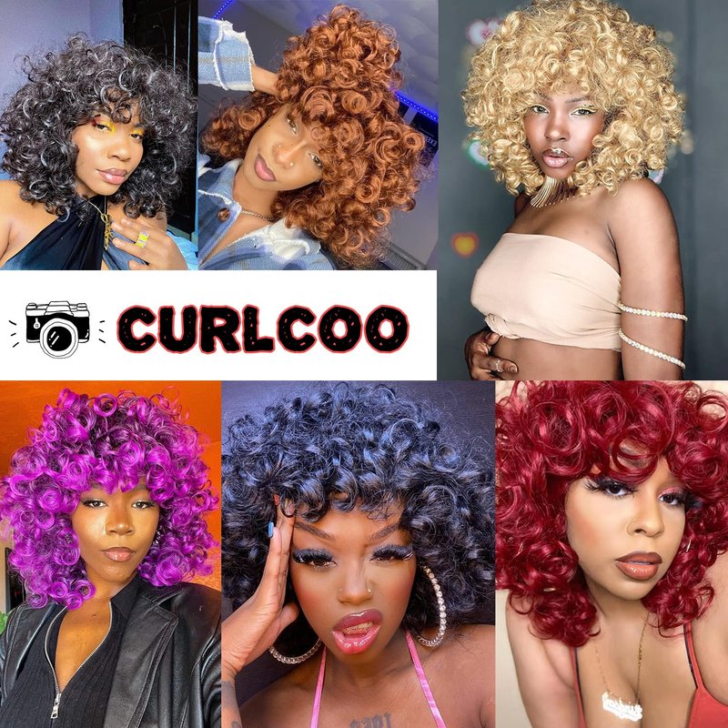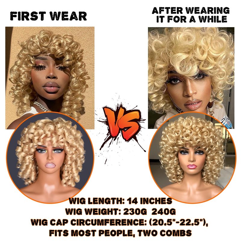CurlCOO Blonde Curly Wigs for Black Women Short Curly Wig with Bangs Soft Big Loose Cute Afro Kinky Curly Hair 14 Inch Synthetic Wig for Black Women(Blonde)