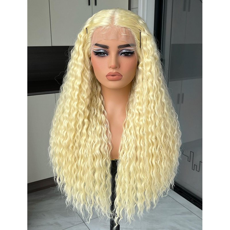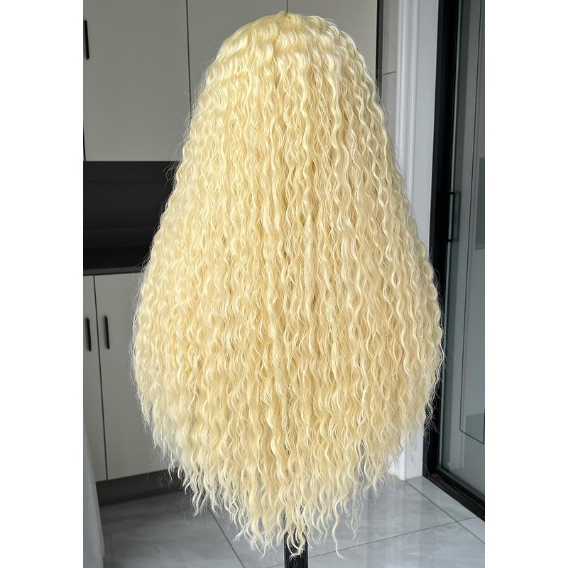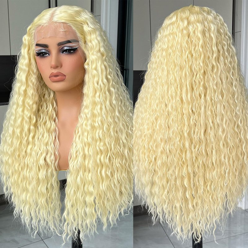 CURLCRAZY Blonde Long Curly Lace Front Wigs for Black Women HD Lace Wig Long Deep Wave Synthetic Lace Front Wig with Baby Hair Pre-plucked Hairline Hair Natural Looking Crimps Curls (26" Blonde)