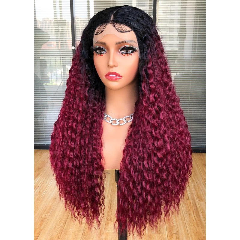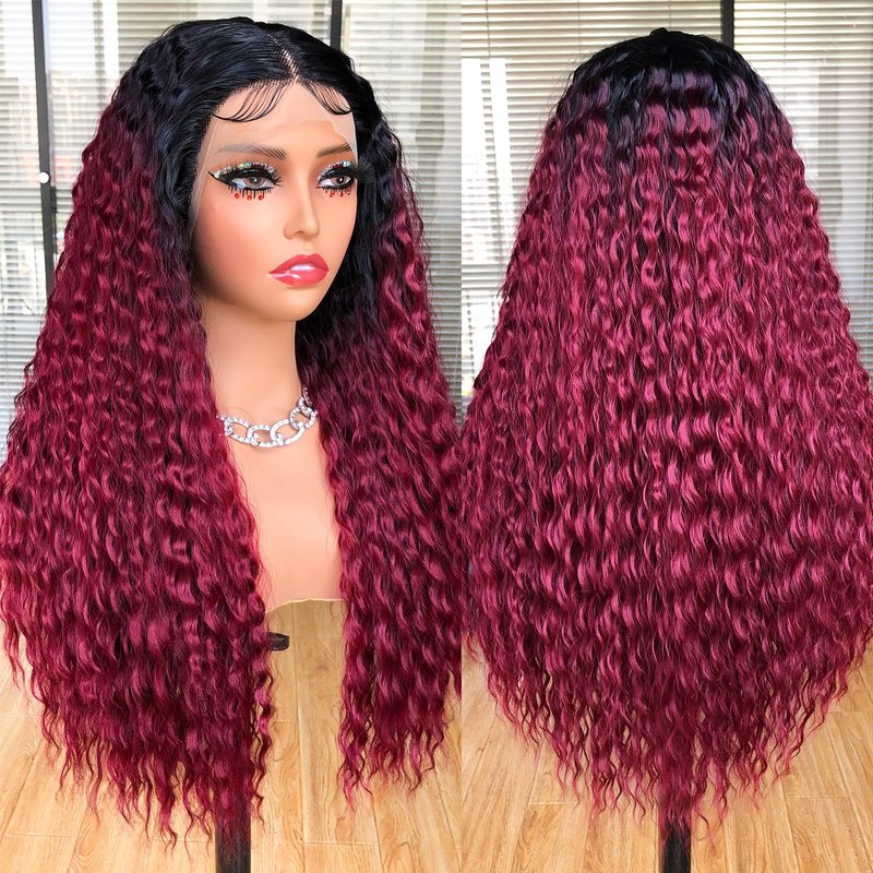CURLCRAZY Long Curly Lace Front Wigs for Black Women Deep Wave HD Lace Frontal Wig Glueless Synthetic Lace Front Wig Pre-plucked with Baby Hair Dark Roots Hair(26" Ombre Red)