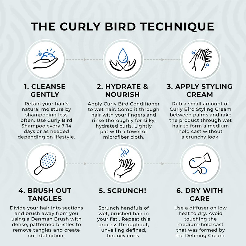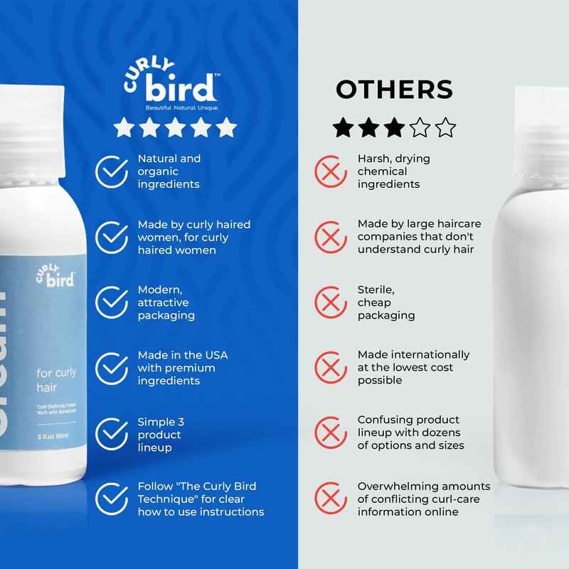 Experience the magic of our Curly Bird Styling Cream – a game-changer for lasting, defined curls without that stiff, crunchy look. Enjoy a flexible hold that locks in moisture and keeps frizz and humidity at bay. Embrace healthier hair with our blend of natural ingredients and botanicals. Suitable for all curl types, it's time to show off your unique curls confidently! Say goodbye to ordinary hair products and embrace the extraordinary. Try it today for vibrant, defined curls that stand the test of time.