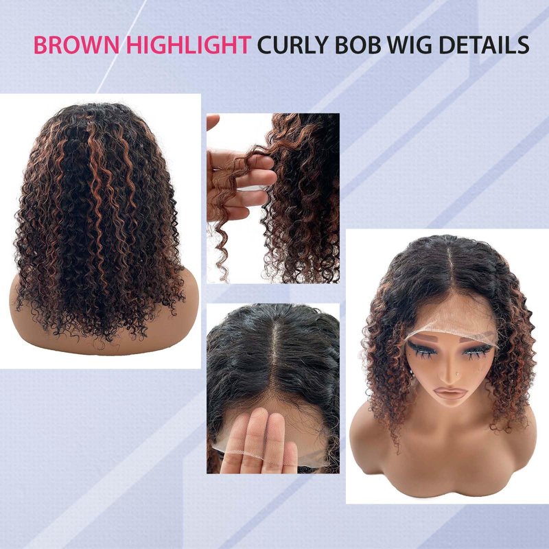 - Curly Highlights Bob Lace Front Wigs Black and Brown: Always adhere to quality first, our curly bob wigs are made of 100% real human hair, soft and smooth, no weird smells, take heat well, can be dyed to any colors as you wish; the hairline of this brown highlight bob wig has a realistic looking and it is semi custom-made, so you can cut the lace & pluck additional hair out yourself
