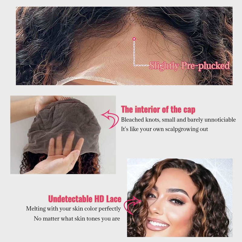 - Real 13x4 HD Transparent Deep Wave Curly Bob Frontal Wigs: our brown highlight bob curly human hair wig is a REAL 13x4 frontal lace wig, ear to ear, standard lace area, can do side part, middle part or c part, which is way better than lace closure wigs and more flexible with undetectable and sturdy HD Lace, blended perfectly in with different skin tones