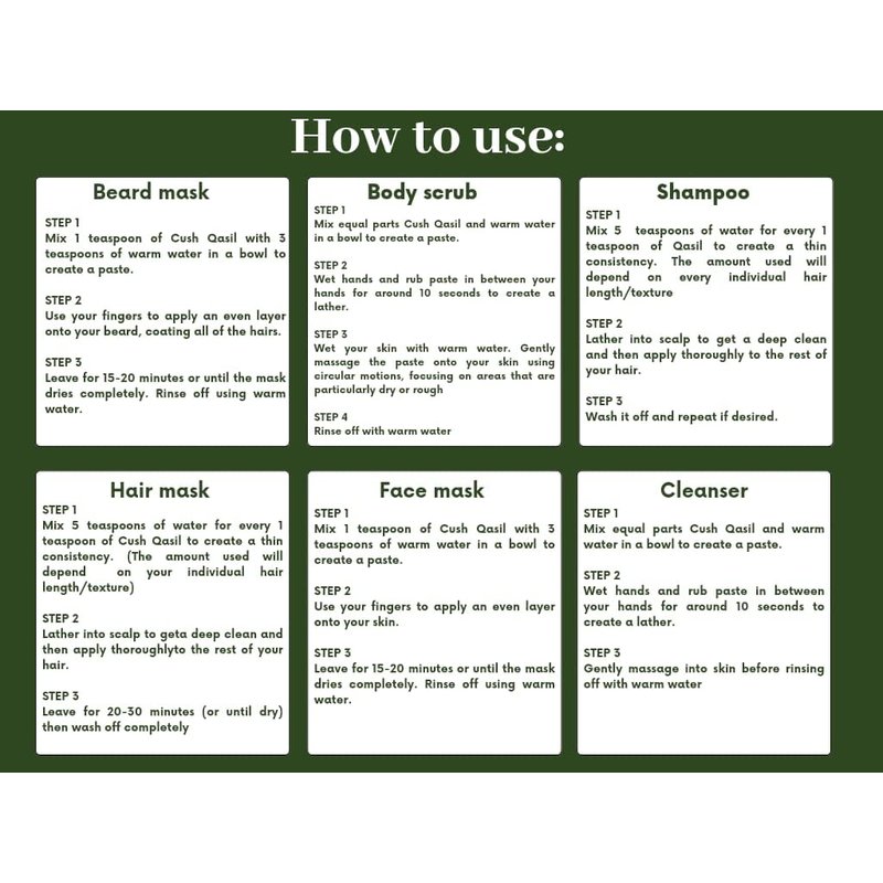 Discover Nature's Best-Kept Secret: Cush Premium Qasil Facial Cleanser Unlock Radiant, Glowing Skin Unveil a refreshed, vibrant complexion with our Qasil facial cleanser, specially formulated to gently exfoliate and cleanse your skin. Say goodbye to dull, tired skin and hello to a smooth, bright, and even skin tone that boosts your confidence in every social setting. Freshness and Quality Guaranteed Our Qasil is air-shipped directly from our trusted supplier to maintain maximum freshness and efficacy. Packaged and tested in the U.S. under strict quality control standards, we ensure that our Qasil retains its natural properties and delivers the best results for your skin. Elevate Your Skincare Routine with Pure Ingredients Our commitment to using 100% pure and natural Qasil sets us apart from the competition. We refuse to compromise on quality, which is why our single-source Qasil powder is free from any additives or contaminants. Treat your skin to the purest, most effective Qasil on the market. Your Journey to Wellness, Self-care, and Empowerment Starts Here Choosing our Qasil facial cleanser means you're not only investing in your skin's health but also embracing a brand that values wellness, self-care, and empowerment. Join our community of happy customers who have experienced the transformative power of our natural, sustainable, and effective skincare products.Ready to glow up? Treat your skin to our luxurious Qasil facial cleanser and watch your complexion reach new heights of radiance. Don't wait – order yours now and give your skin the VIP treatment it deserves!