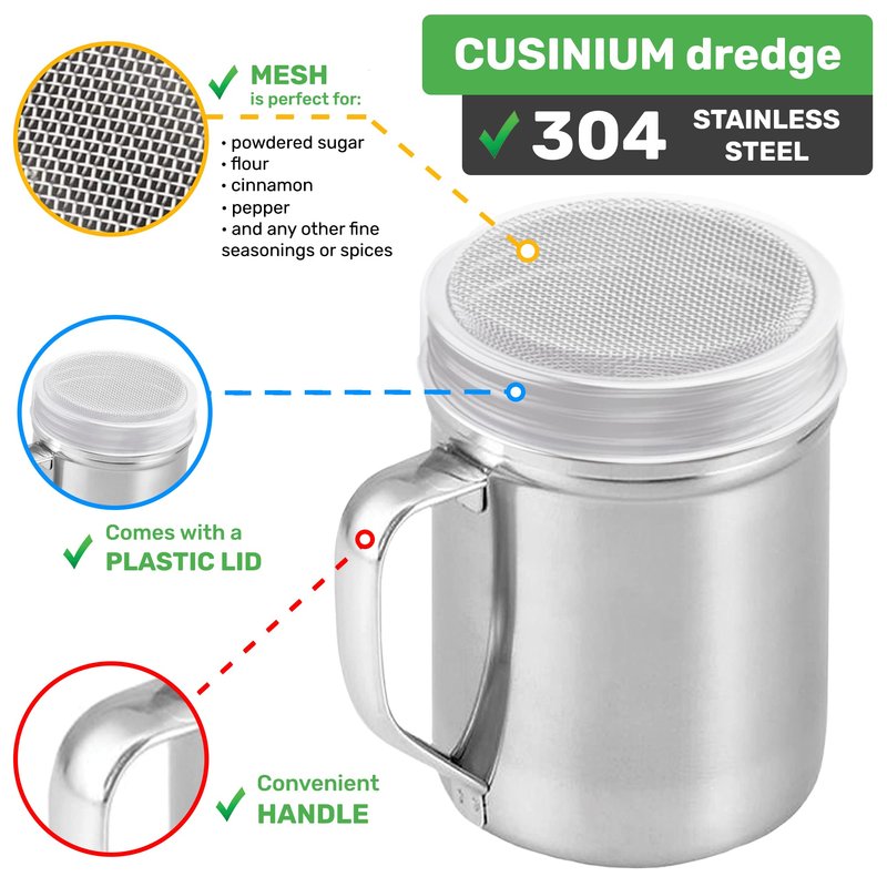 - Dredges are dishwasher safe with metal-friendly detergents