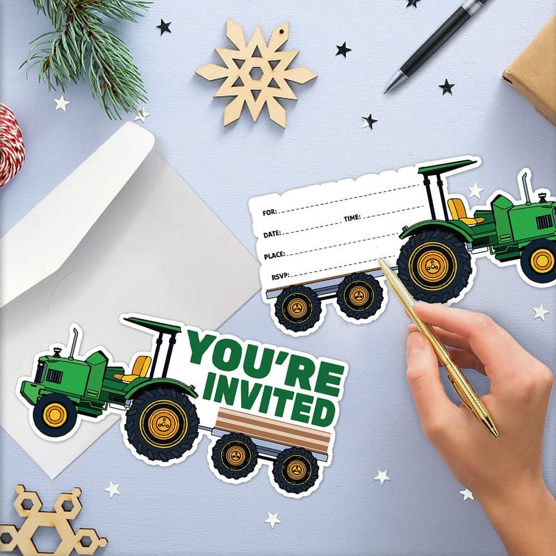 Cusrtyh 15 Sheets Tractor Party Celebration Invitations card with with 15 Envelopes,Green Tractor Birthday Party,Farmer Tractor Party Celebration Invitation cards, Birthday Party Supplies