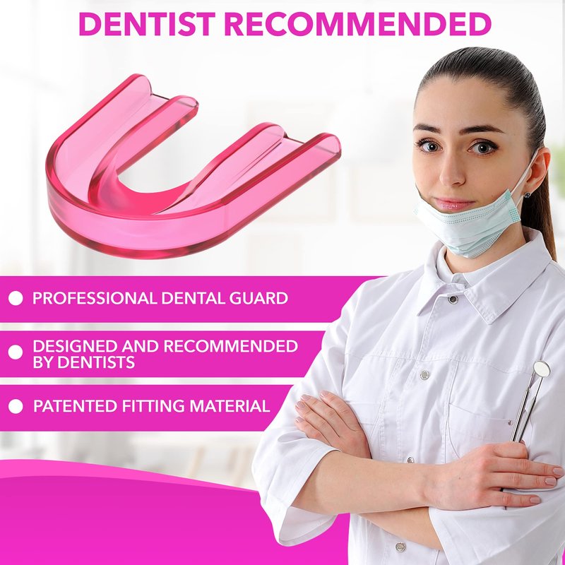 CustMbite Nightguard For Kids - Pack of 2 Includes: 2 pink CustMbite Kids nightguards 1 Travel Case Step-by-step instructions for the fitting process. Our high-quality mouthguard was designed by dentists to help kids prevent bruxing, teeth grinding, and clenching. It is BPA free and made from a hydrophobic fitting material that ensures a tight, comfortable fit for kids. It can withstand grinding and does not need to be replaced frequently like many other nightguards. Simply put, our night guard is the best solution for teeth grinders. It fits on the upper teeth and protects both your upper and lower teeth. It features a slim design. Each package comes with 2 night guards and a portable hygiene case. Our kids mouth guards are easy to fit with your microwave and can be remolded if necessary. Our night guards are Made in America.