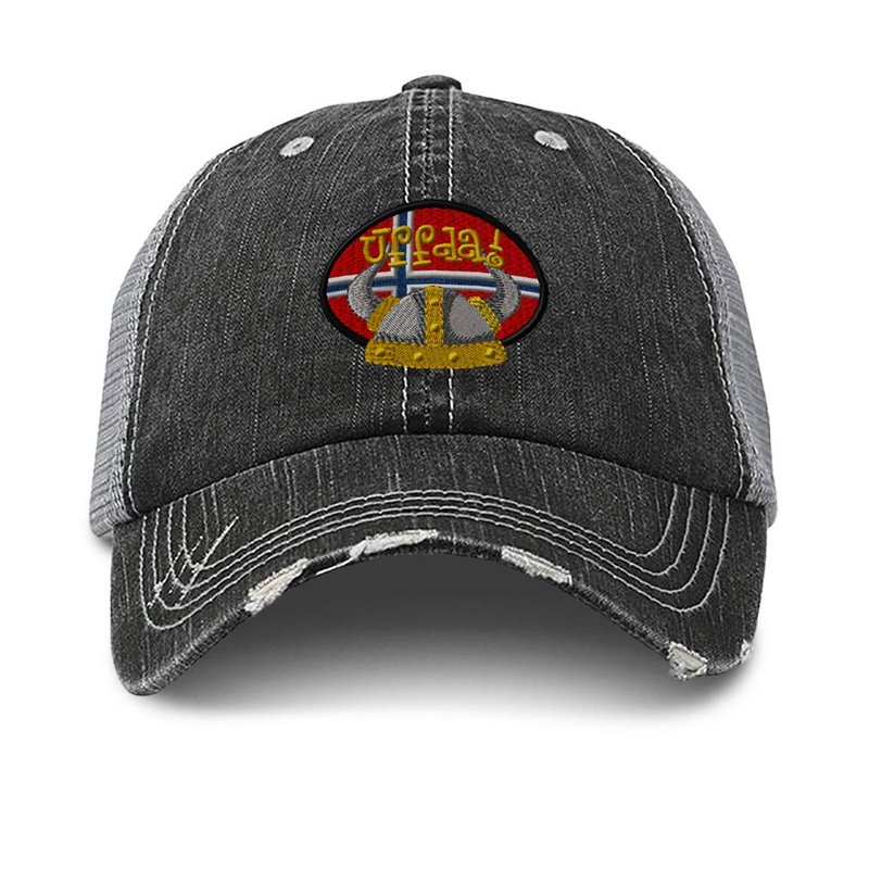 Custom Distressed Trucker Hat Uffda! Embroidery Cotton for Men & Women Strap Closure Black Gray Design Only