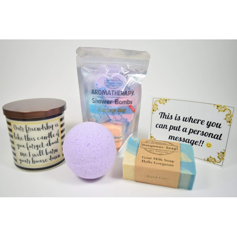 Gift box 12: message candle, bath bomb, goat milk soap, and shower bombs