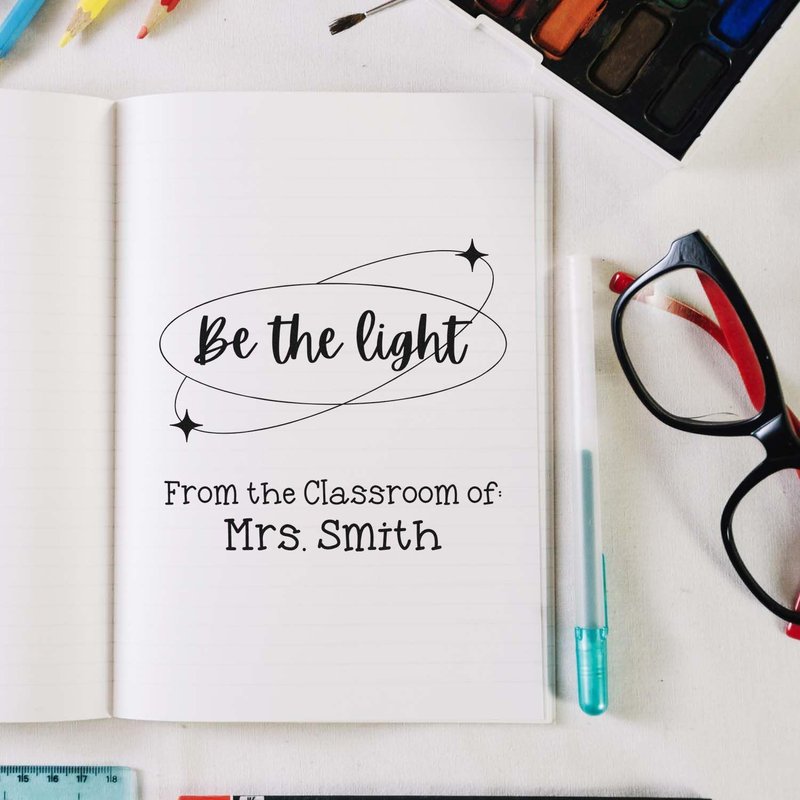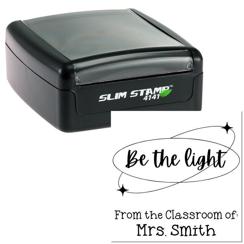Custom Name Stamp Slim Pre-Inked Personalized Stamp with Be The Light Design, Custom-Made 1-5/8" Square Teacher Stamp for Classroom Materials, Durable and Easy to Use