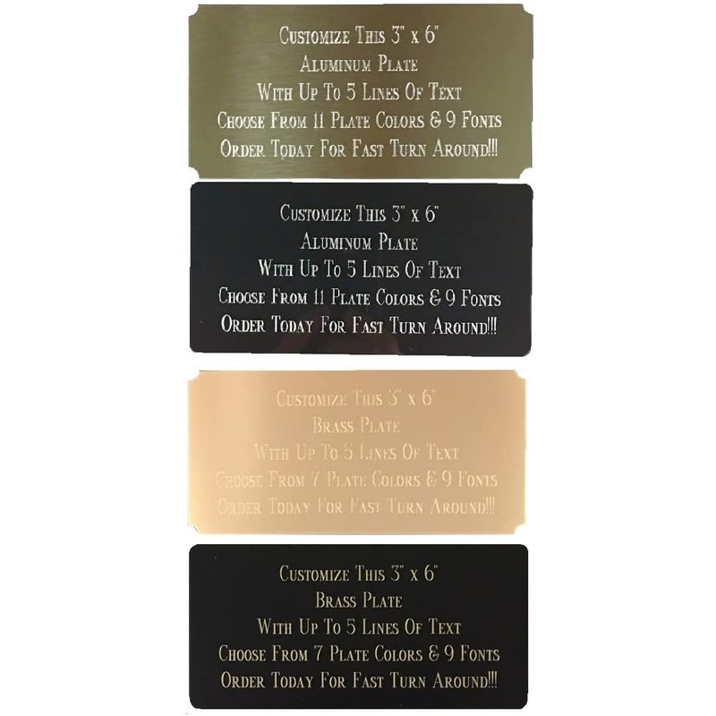 - ·PLATE SPECIFICS: You can have up to 5 lines of engraving. ALL ENGRAVING WILL BE GOLD IN COLOR FOR BRASS AND SILVER IN COLOR FOR ALUMINUM! Plate Color Choices: Gold, Black, Red, Blue, White, Red-Marbled or Black-Marbled for brass and Gold, Black, Red, Blue, Copper, Silver, Violet, Purple, Green, Red-Marbled or Black-Marbled for aluminum.