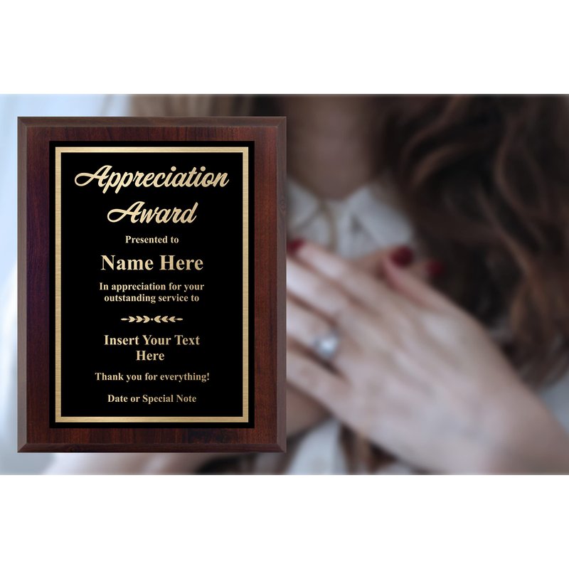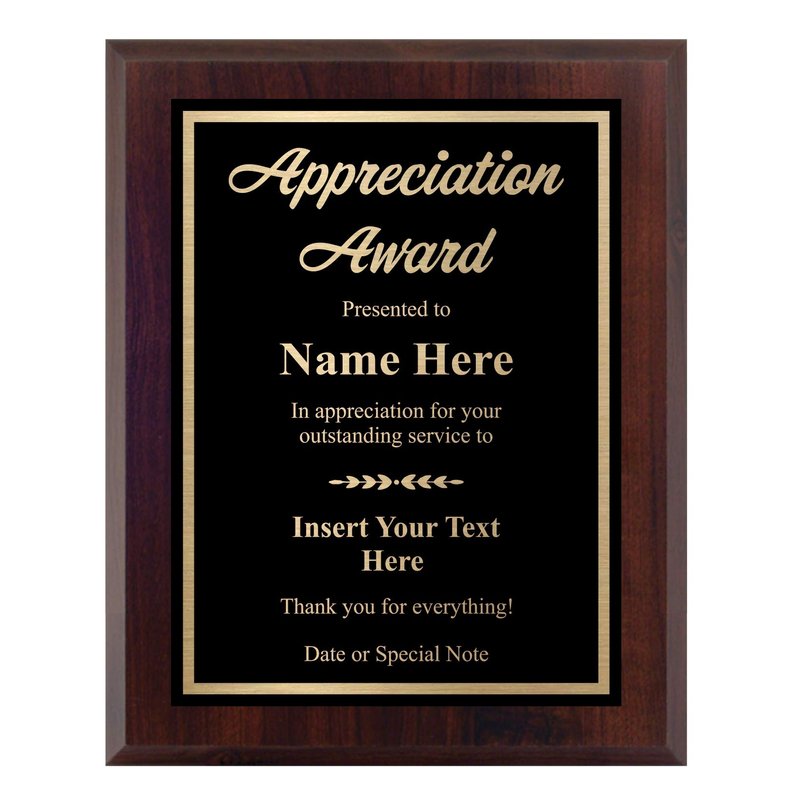 - Custom Appreciation Plaque Award - Honor a job well done with a personalized plaque! Our high-quality award is laser engraved with your text to create a lasting impression. The reflective metal plate is easy to read and looks elegant on any wall.
