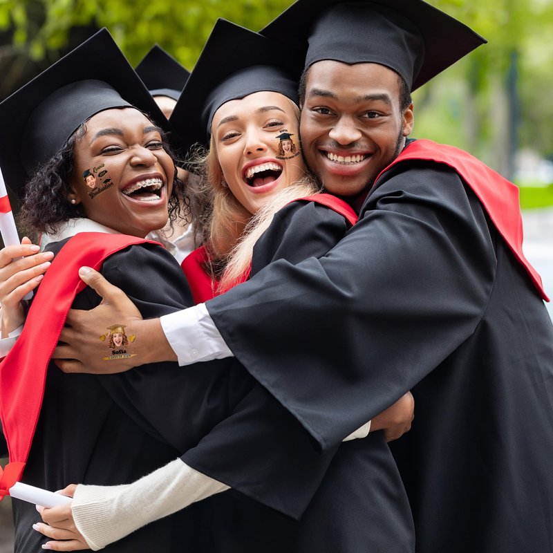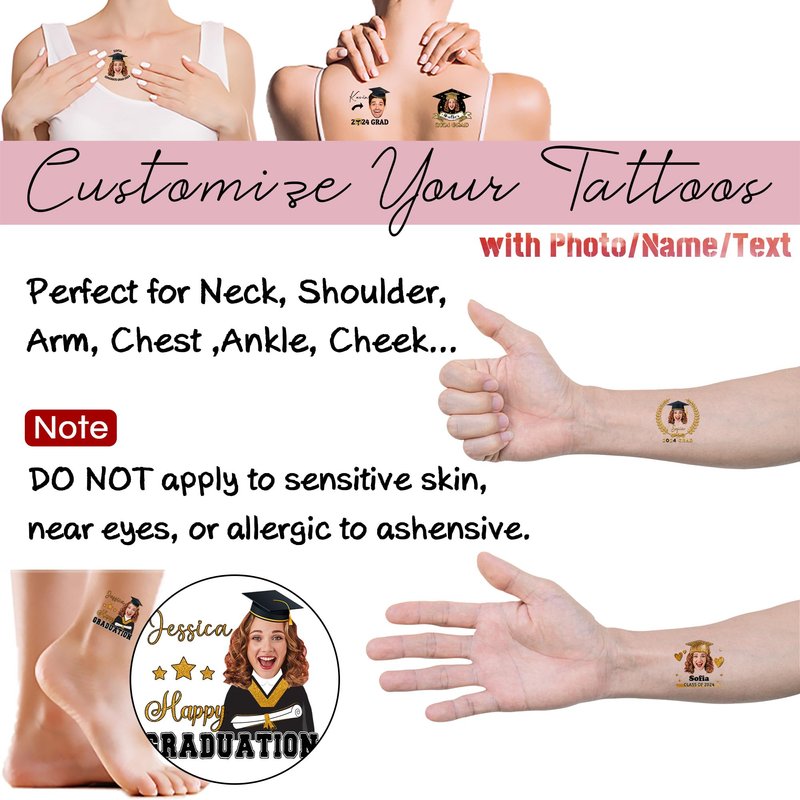 - 🎓OWN UNIQUE TATTOO:The hard work is over! Personalize your own unique tattoos with your name,photo or text!Show off your style with stickers.Customize the temporary tattoo sticker with faces name or text for your graduation celebration and give it to every friend, make this ceremoney unique.You can share with friends,family,colleagues,lover,besties as special decors or graduation party celebration supplies.