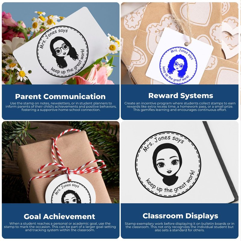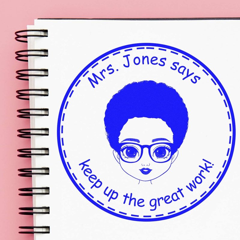 The design of the product features the Ms. Lillian Design, a personalized personal emoji motivational stamp that includes a female emoji avatar icon. The stamp is personalized with the text "Your Name says keep up the great work," but any text may be added for a special touch. With a size of 1-5/8 Round Diameter, this stamp is compact yet impactful.