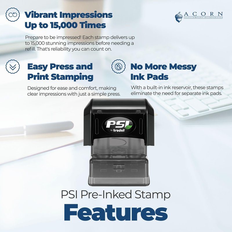 The PSI Pre-Inked Stamps are renowned for their superior imprint clarity, delivering striking impressions that stand out with every use. Choose from a palette of five distinct ink colors to personalize your stamping experience to fit your style or organizational needs. Engineered to create up to 15,000 dynamic impressions, these stamps ensure long-lasting use before there's any need to re-ink.