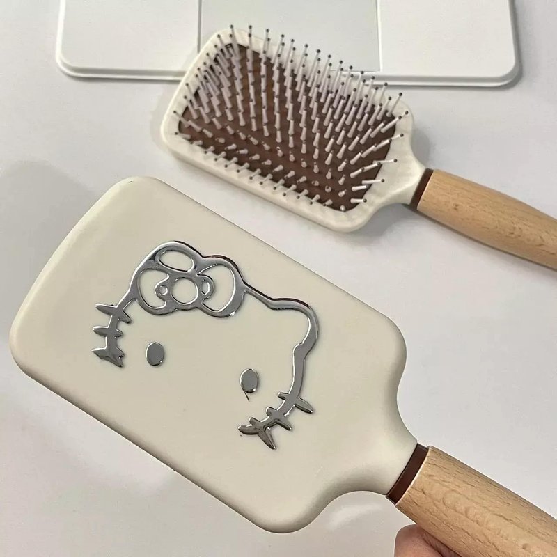 Cute Cartoon Hair Brush with small mirror for Women & Girls, Wooden Handle Friendly Massage Scalp Brush for Thick Curly Thin Long Short Wet & Dry Hair