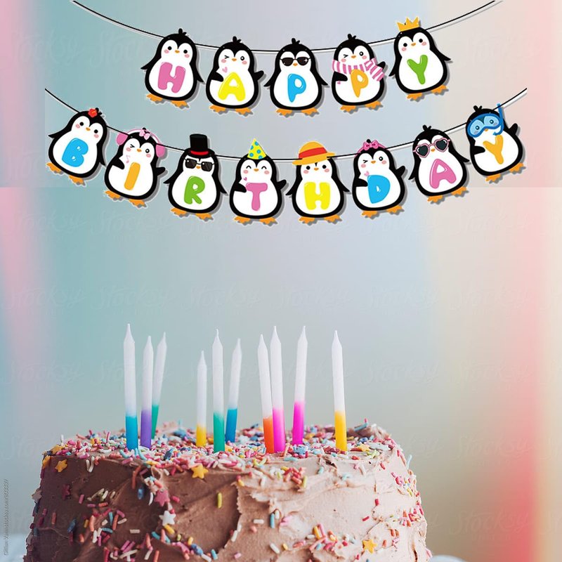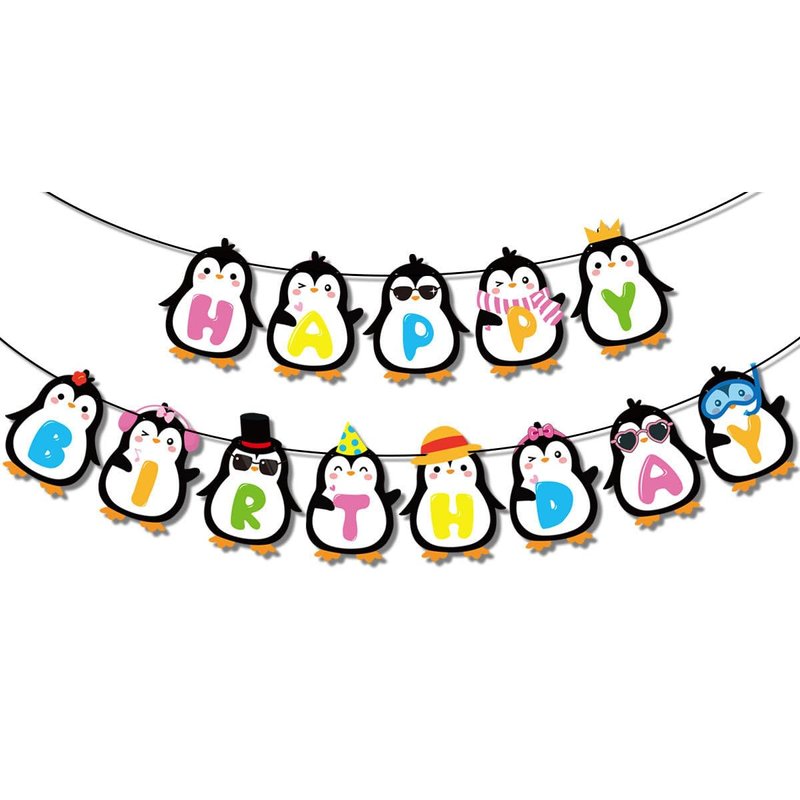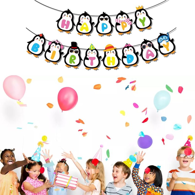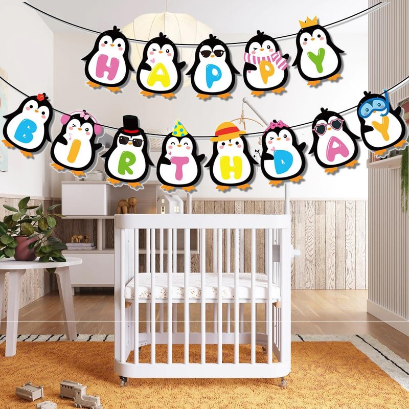 Cute Penguin Happy Birthday Banner, Penguin Birthday Party Decorations, Boy Girl Baby Shower Cartoon Animal Theme Supplies Garland, Winter Onederland Kids 1st First Bday Decor