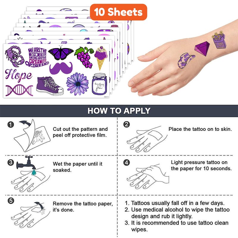 - What You Get: We would like to provide you with 10 sheets tattoos for you, including various styles, sufficient in quantities and styles to meet your daily requirement of using and decorating. Children can easily use this set of Cute Purple party decorations with this Purple Violet temporary tattoos and take unique photos to make fond memories. The size of each sheet is 6.1 * 3.1 inches.