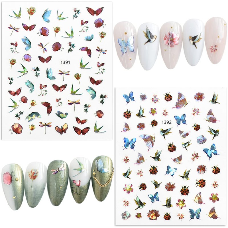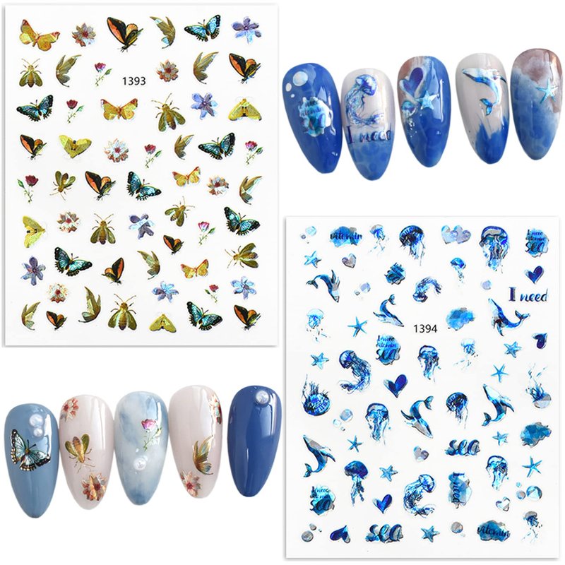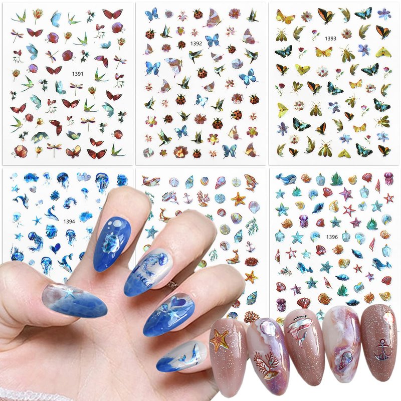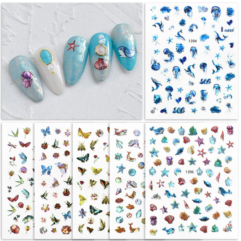 - 【Quantity】You will get 6 sheets cute animal nail art stickers, 3D self-adhesive nail decals design, each paper measure 3.7 x 3 inches(9.5 x 7 cm). Contains a variety of patterns: flowers, butterfly, dragonfly, bird, fish, starfish, jellyfish, whale, shells, etc. These sea animal nail stickers are perfect for summer nail art at the beach.