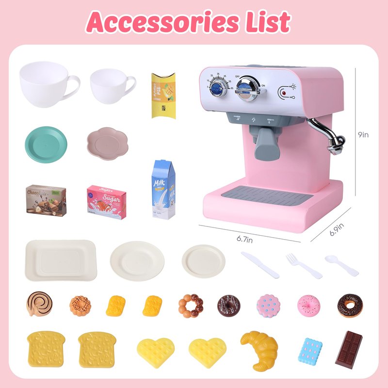 - Realistic Funcation:Pour water into the coffee machine, turn on the button switch to simulate the sounds of water boiling, the indicator light will go on, and the "steam" will come out from the outlet so that your child will feel like making real coffee