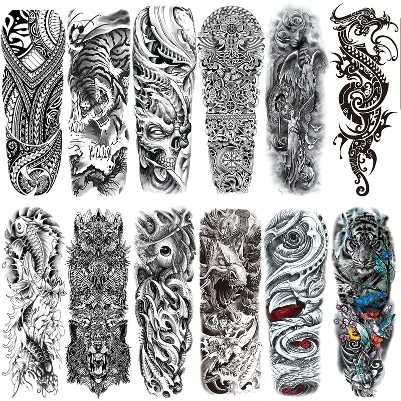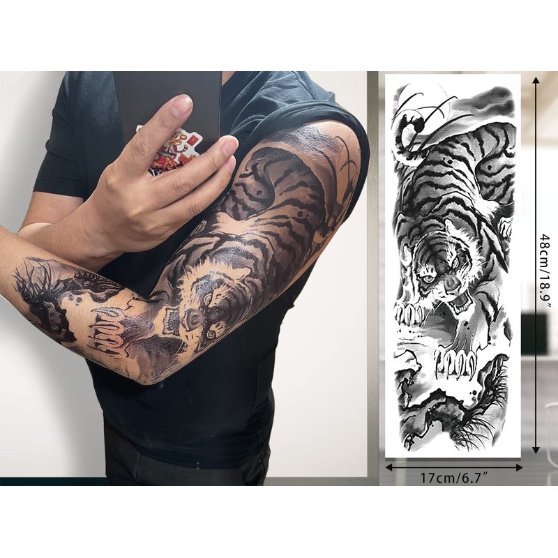 full arm temporary tattoo foradult,Sleeve Temporary Tattoos - Realistic, Waterproof, Durable. Large temporary tattoos with dragon, tiger and skull